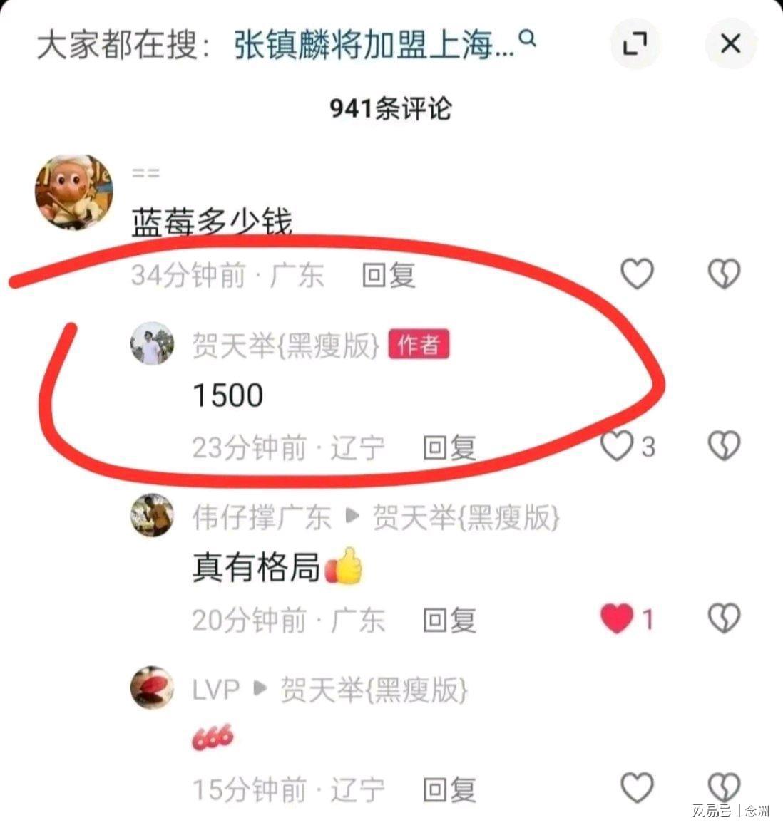最近,张镇麟离开辽宁队,贺天举发文,对他进行怀念和祝福。然而一名IP地址为广东的球迷留言,问他视频里的蓝莓怎么卖,贺天举则回复道:1500元。